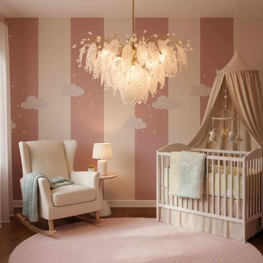 A statement chandelier or pendant light draws the eye up, but ensure it is on a dimmer. You never want to startle a sleepy baby with harsh bright light.