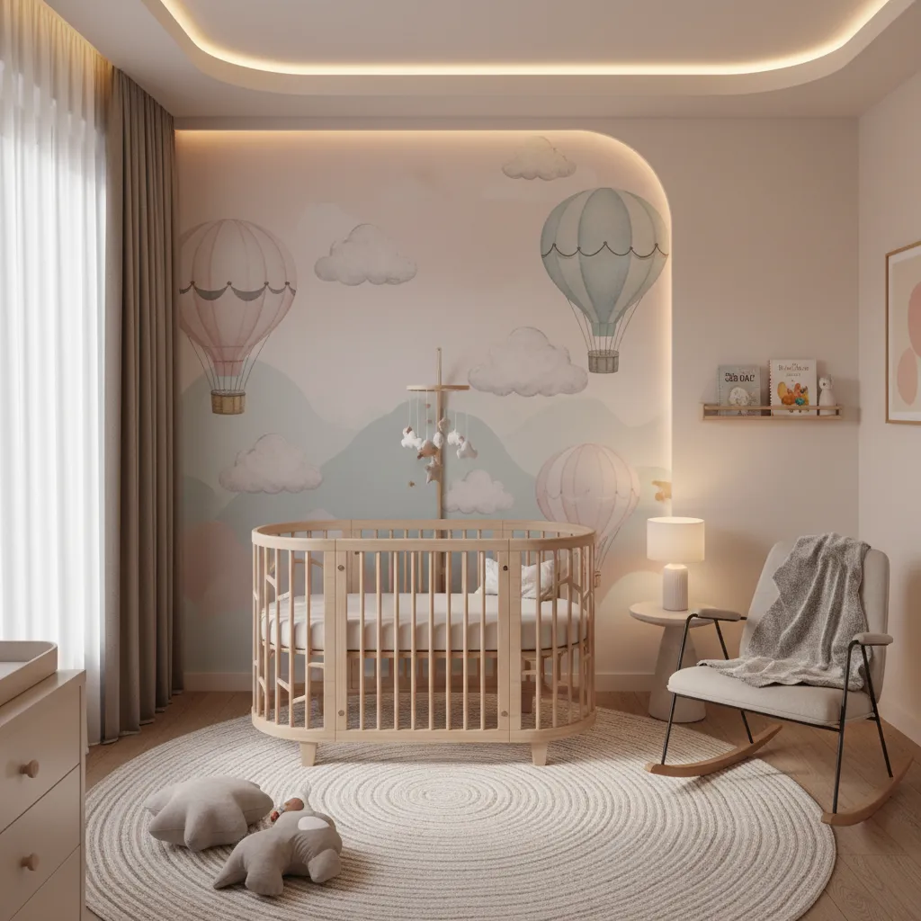 Since the crib is the focal point, choose one with personality. An oval crib, a clear acrylic crib, or a vintage iron crib can define the room’s style instantly. Place it centrally or against the main feature wall for maximum impact.