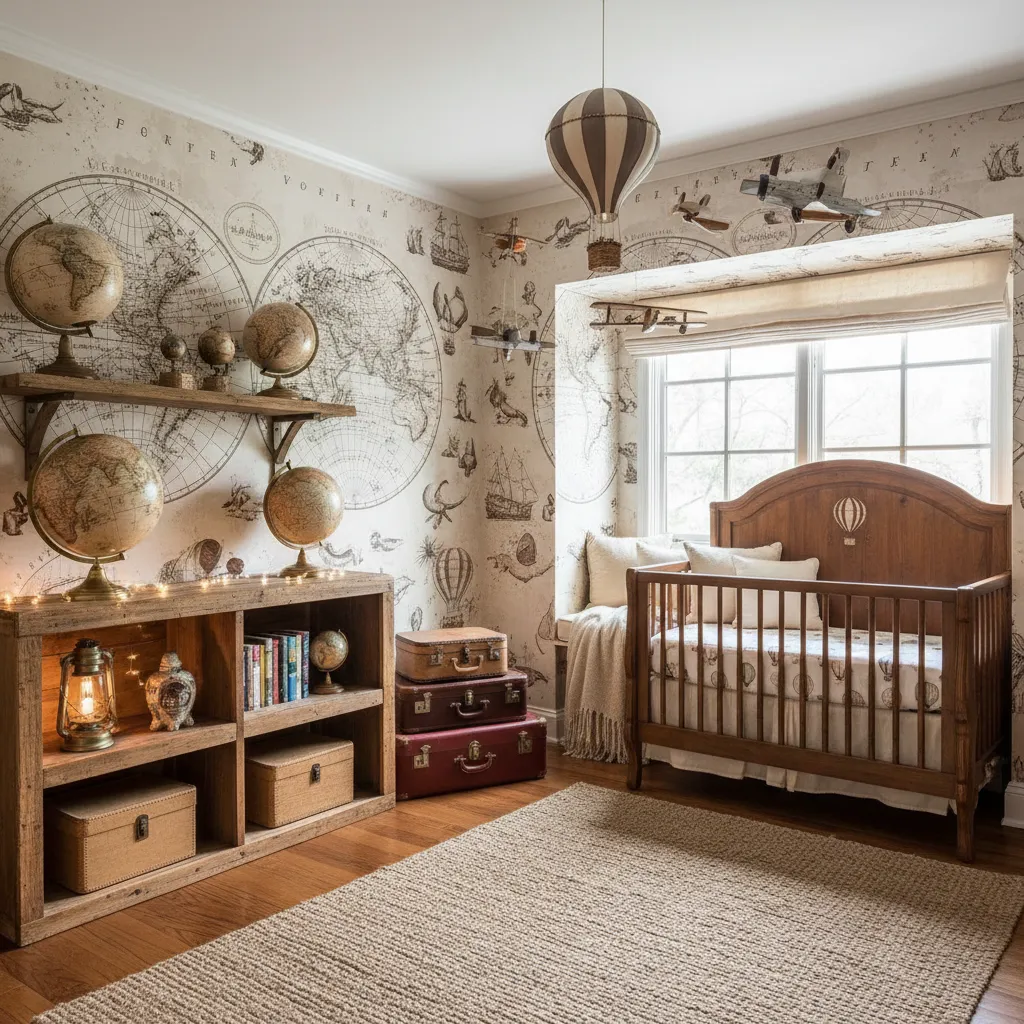 Antique maps, globes, and vintage travel suitcases used as storage create a sense of adventure. This theme is intellectual and charming, perfect for raising a little explorer. It pairs beautifully with leather accents and dark wood.