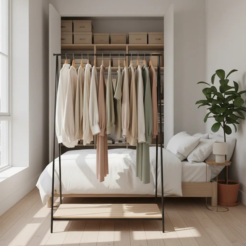 If your closet is tiny, consider an external clothing rack. A simple metal rack can look chic if you curate the clothes hanging on it—think of it as functional decor. This is a strategy often used when exploring Bedroom Design Ideas for Men, where industrial and minimalist aesthetics often overlap.