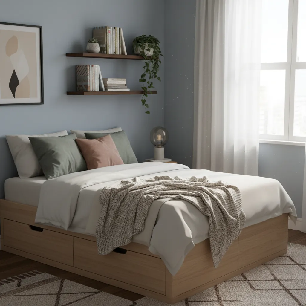 Use vertical space with wall-mounted shelves and tall bookcases. Under-bed storage boxes, over-the-door organizers, and storage ottomans are practical solutions that keep the room tidy without taking up extra floor space.