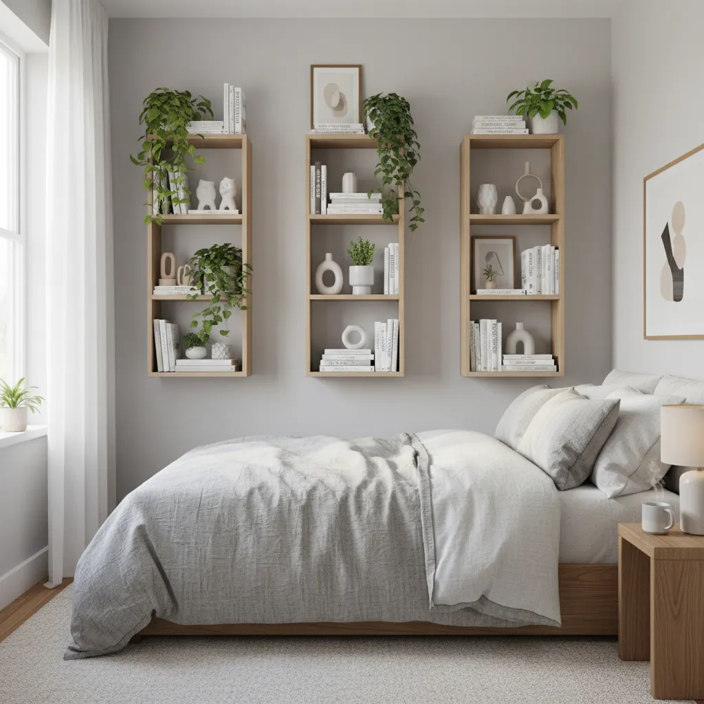Don’t let your walls go to waste. Floating shelves are incredibly cheap to install and draw the eye upward, making ceilings feel higher. Use them to display books, plants, or small art pieces. This approach works wonderfully if you are looking for Bedroom Wall Decor Ideas that save floor space while adding personality.