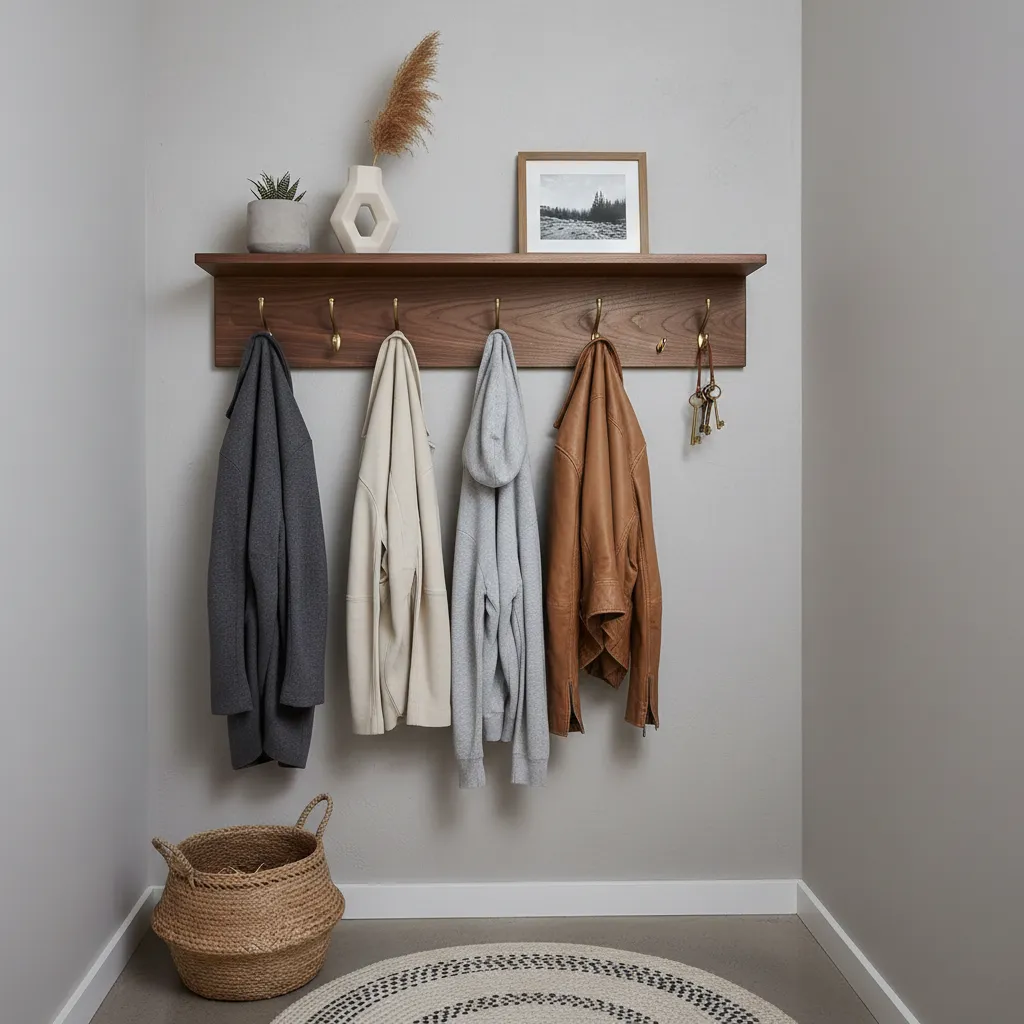 If you lack space for furniture, a stylish wall-mounted coat rack with an integrated shelf is a perfect alternative. It combines hanging space and a spot for small items in one streamlined piece.