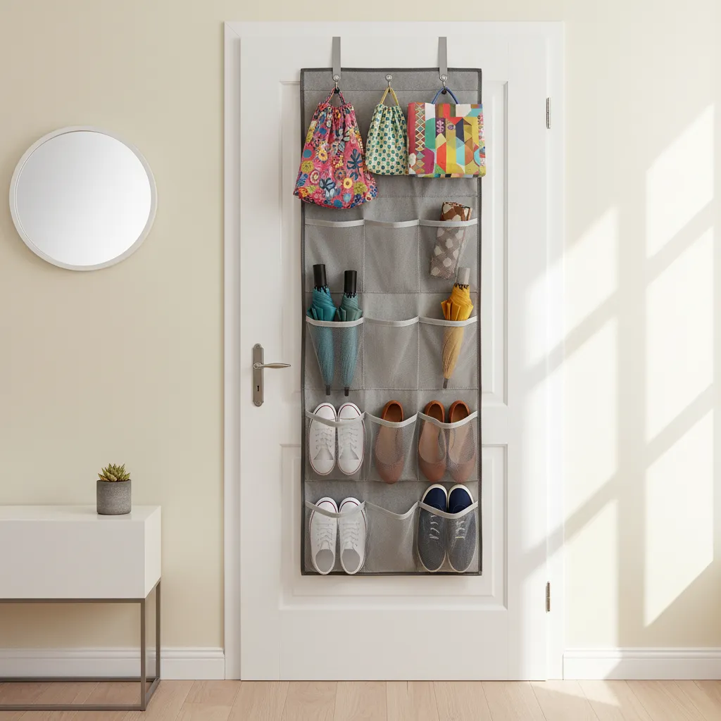 Over-the-door organizers aren’t just for bathrooms. Use one on your entry closet door or even the main door for shoes, umbrellas, or reusable shopping bags.
