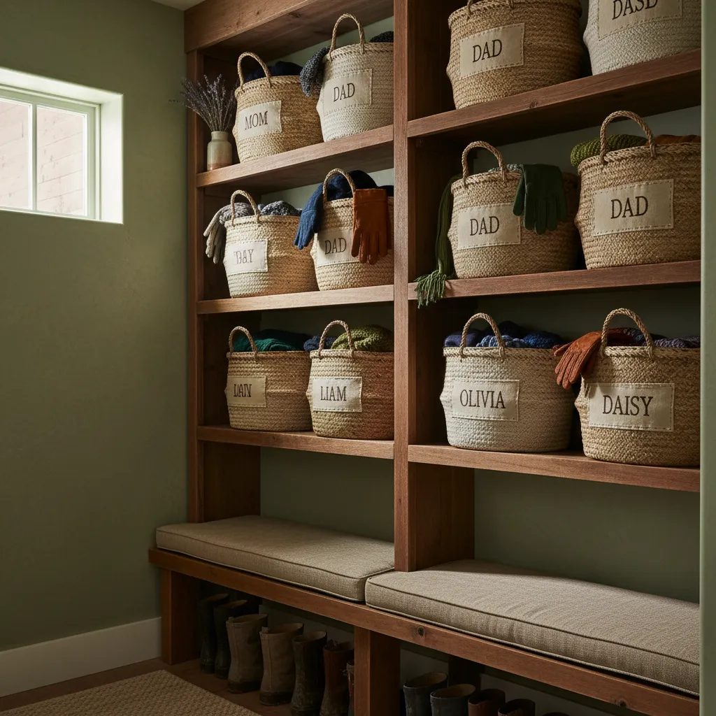 Place large, sturdy baskets on shelves or inside cubbies. Assign one to each person in the household for their hats, gloves, and scarves. This personalizes the space and makes it easy for everyone to find their things.