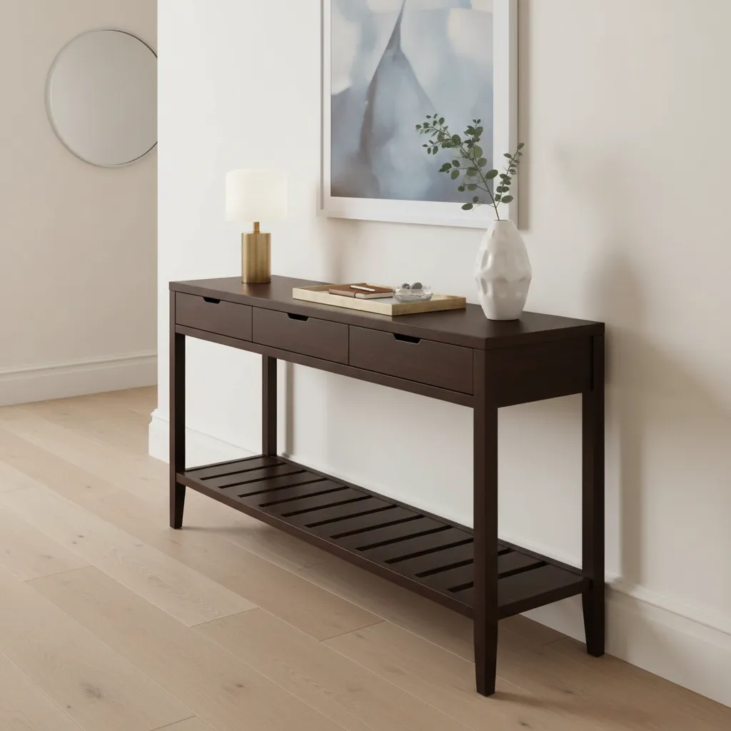 If you have a narrow hallway, a slim console table with drawers or a lower shelf can be a game-changer. The top surface is perfect for a catch-all tray and a bit of decor, while the drawers can hide away mail, keys, and other small essentials.