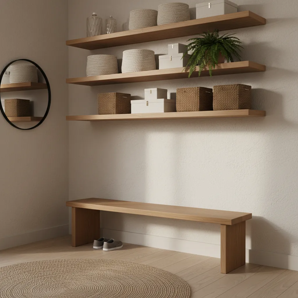 Floating shelves are a small entryway’s best friend. Install a series of shelves above a bench or along a wall to hold baskets, decorative boxes, or even just your keys and mail. This is a simple yet effective decor idea that adds storage without taking up any floor space.