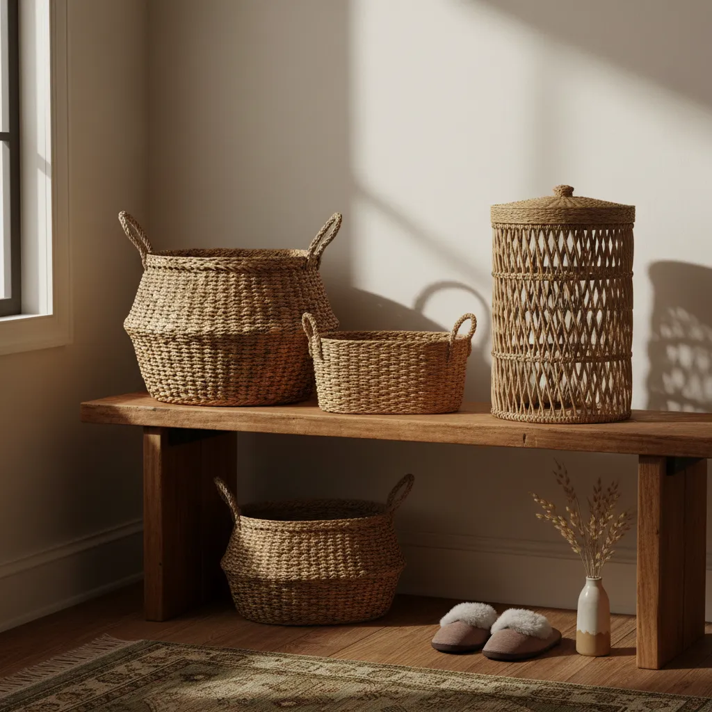 Using natural materials is a wonderful home decor idea to make a space feel inviting. Woven baskets made of seagrass or rattan add texture and a cozy, organic feel to your entryway while keeping things neat.