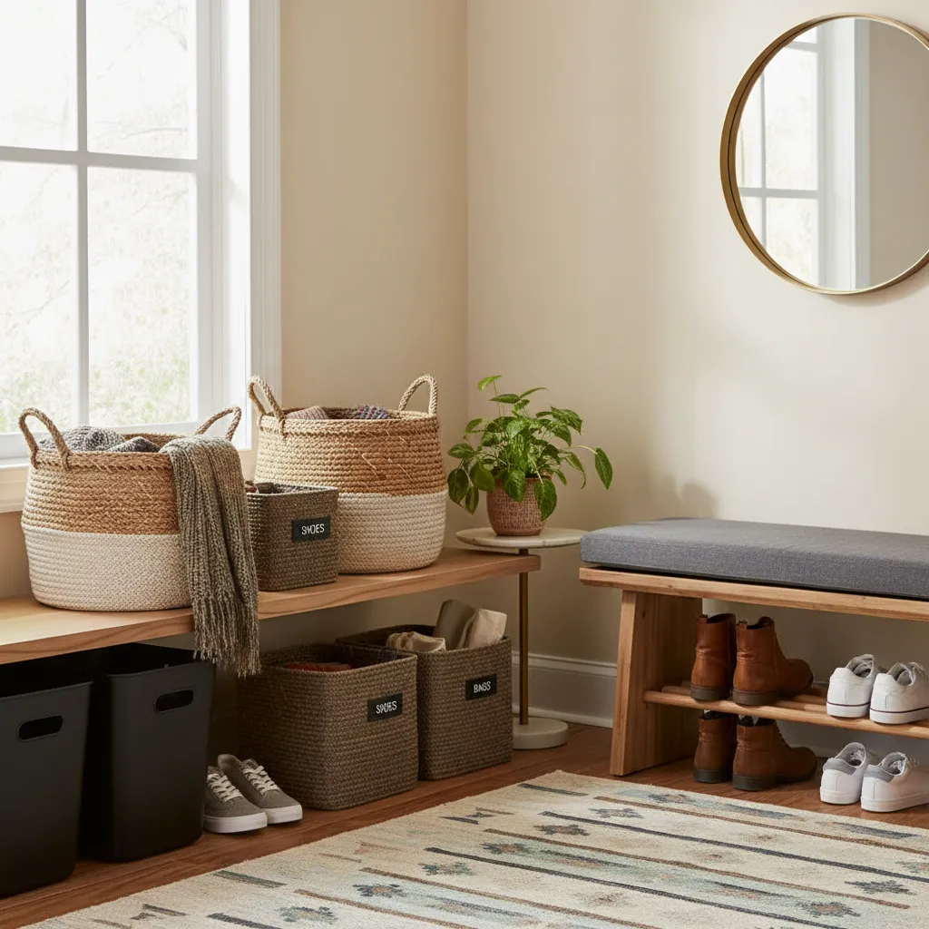 Baskets are a stylish solution for hiding clutter. Use them on shelves, under a bench, or directly on the floor. Assign different baskets for shoes, winter accessories, or even reusable shopping bags to keep everything tidy and easy to find.
