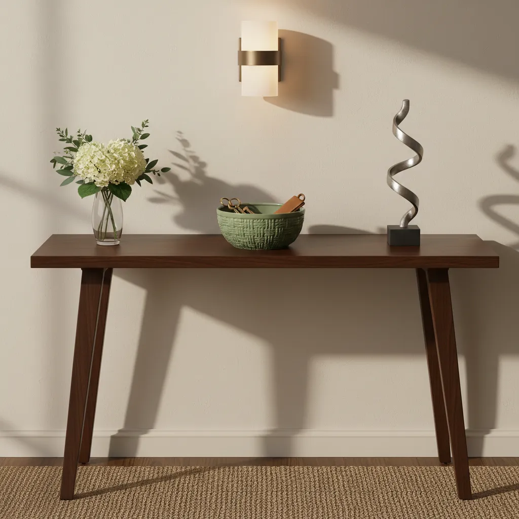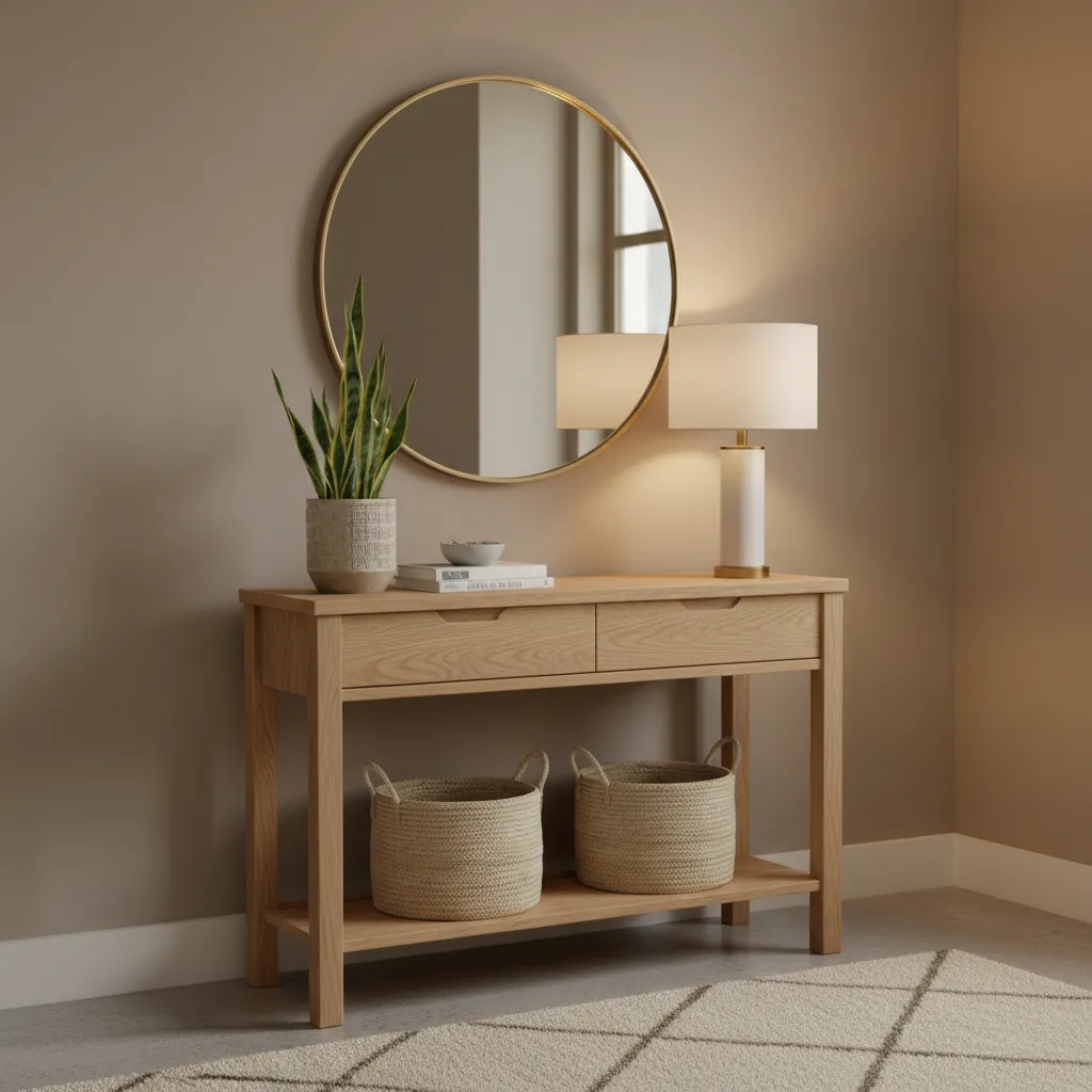 If you have a bit of wall space, a slim console table can be a game-changer. Look for one with a narrow depth to avoid blocking the walkway. Tables with drawers or a lower shelf provide hidden storage for items you don’t want on display.