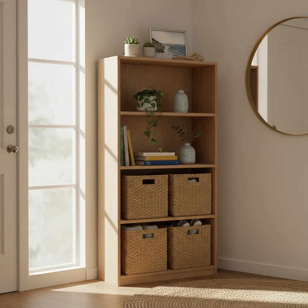 A slender bookcase can offer significant storage. Look for a “ladder” or “leaning” style shelf, as their open design feels less heavy in a small space. Use baskets on the lower shelves for shoes and the upper shelves for decor, mail, and other daily essentials.