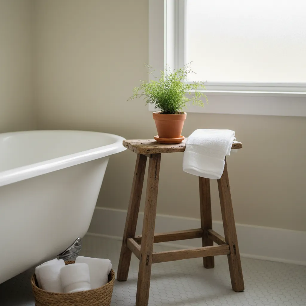 If you have a sliver of space, a small wooden stool can be incredibly versatile. Use it as a spot to set a towel, a plant, or a cup of tea while you soak in the tub.