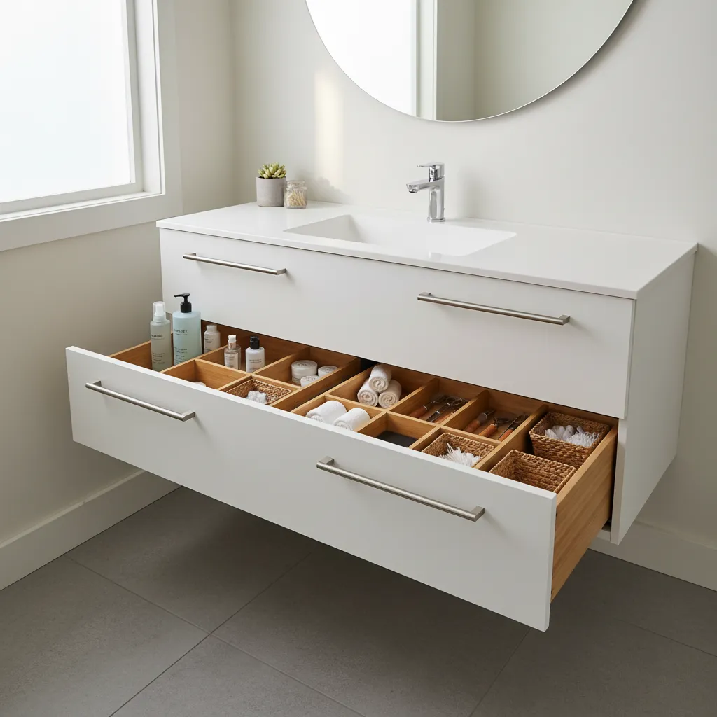 A vanity with deep drawers is often more practical than one with cabinets. Drawers allow you to see and access all your items easily, preventing things from getting lost in the back. Use drawer dividers to keep everything neat and tidy.