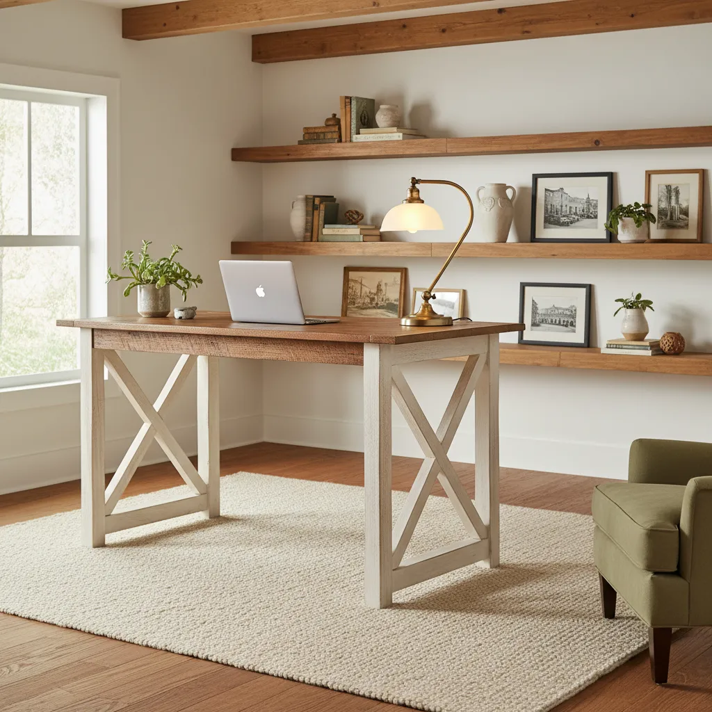 Some standing desks incorporate decorative X-frames on the sides to mimic traditional farmhouse tables. This design hides the modern lifting columns inside a more traditional aesthetic.