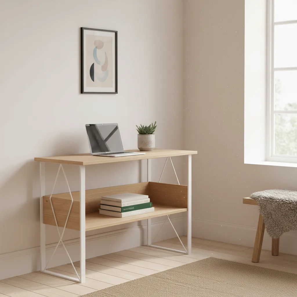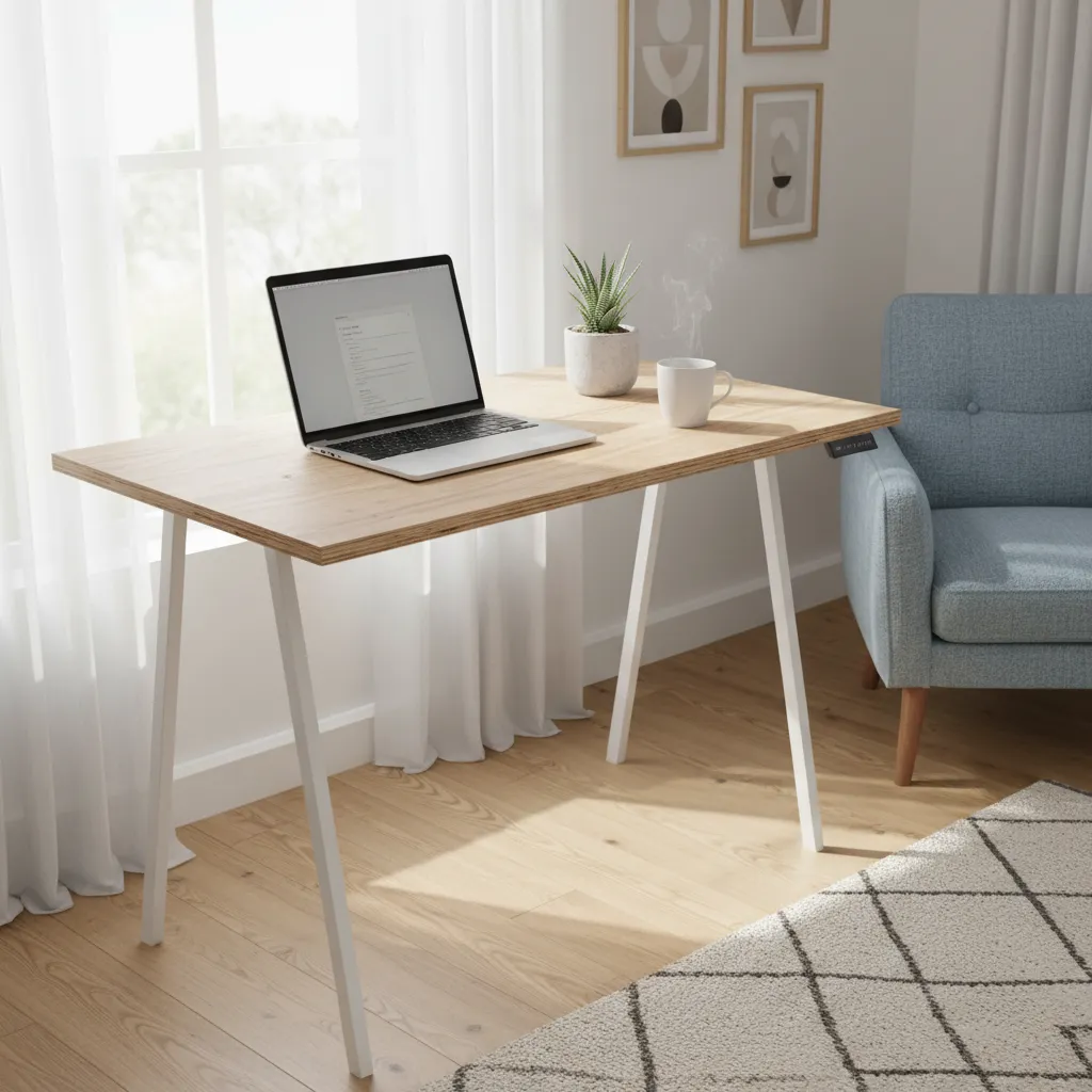Nordic design is famous for blending functionality with warmth. A standing desk featuring a raw plywood top and white legs brings an organic, calming element indoors. It pairs beautifully with some simple Office Plants Decor Ideas to bring life to your workspace.