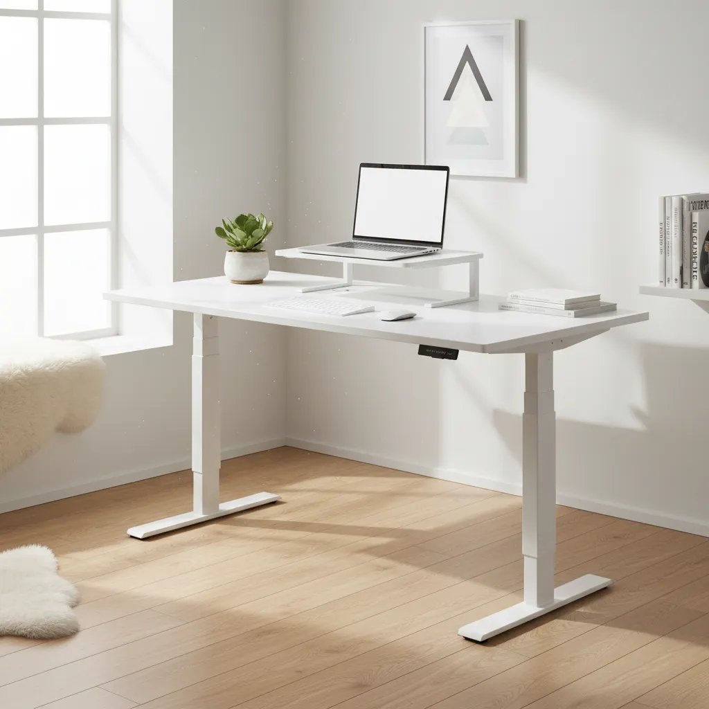 An all-white motorized desk creates a crisp, distraction-free zone. Pairing this with a slim white monitor stand keeps the look cohesive. This style works exceptionally well if you want a light, airy feel in your room.