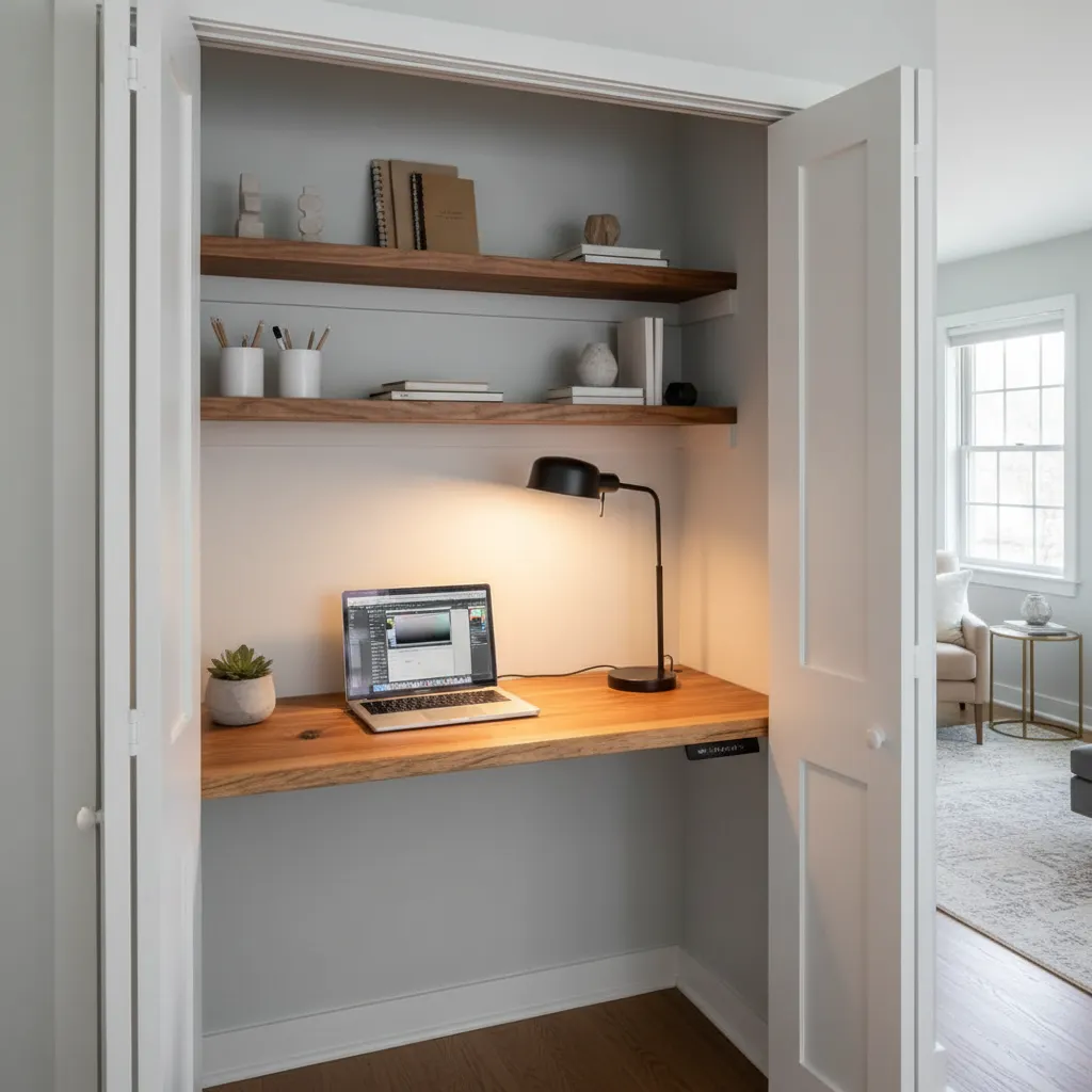 Transforming a spare closet into an office is a brilliant apartment hack. Install a custom-cut piece of wood on heavy-duty adjustable brackets inside the closet. When you are done working, just close the door to hide your workspace entirely.