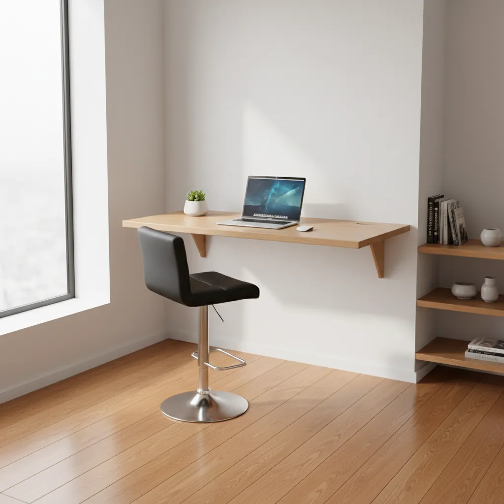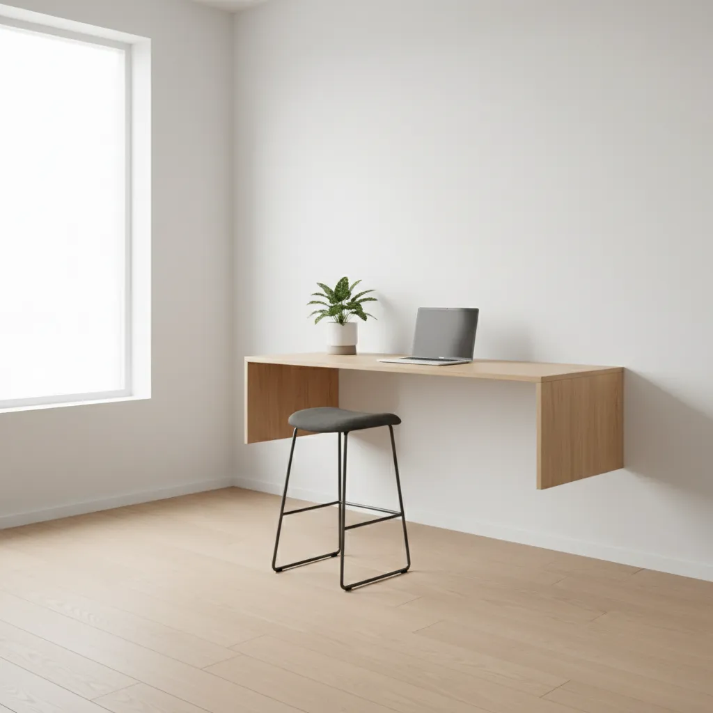 If you want the ultimate minimalist look, a floating desk mounted at standing height clears up all floor space. While you cannot easily adjust the height, it is a striking architectural choice. Pair it with a tall drafting stool for sitting breaks.