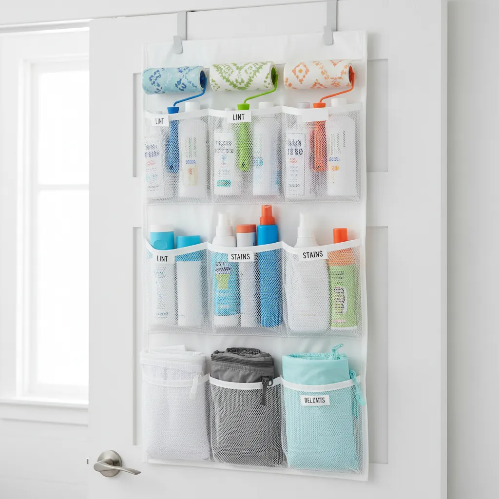 Use labeled baskets, bins, and trays for sorting items. Keep frequently used supplies within reach, hide cleaning products in cabinets, and maintain clear surfaces for folding or sorting laundry.