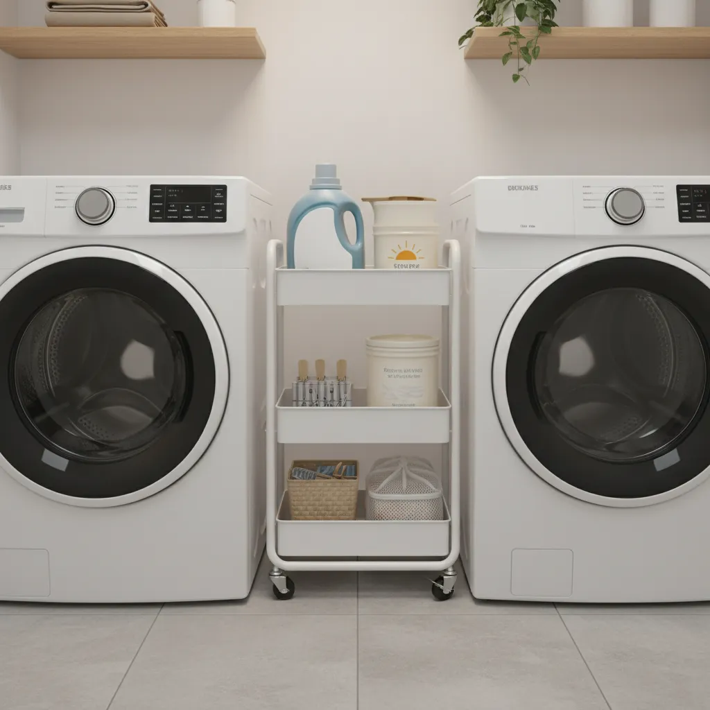 Compact or stackable washer and dryer units, foldable or pull-out counters, cabinets, and rolling carts provide functionality while keeping the area tidy and accessible.