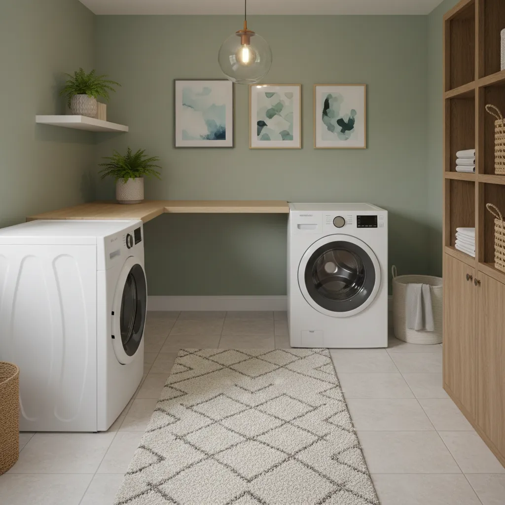 Place a soft, washable runner rug in front of the washer and dryer to cushion your feet and add color. Hang a piece of artwork or a framed print on the wall. Maybe add a small potted plant (real or faux) on a shelf for a pop of green. These small decor ideas infuse personality and warmth, transforming a workspace into a living space.