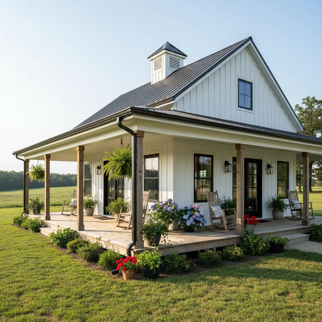 Nothing says “welcome home” quite like a crisp white exterior. Pairing vertical white metal siding with black window frames creates a timeless look. A wrap-around porch adds that essential layer of coziness, providing space for rocking chairs and potted plants. If you want to enhance the porch seasonally, check out these Beautiful Floral Decor Ideas for Every Room which can easily translate to outdoor patio styling.