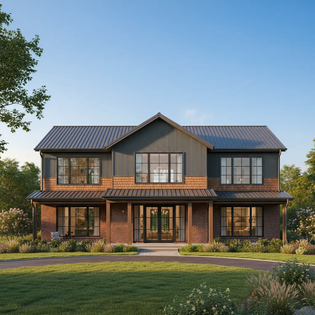 Why choose one material when you can have three? A combination of corrugated metal, cedar shake shingles, and brick creates a rich tapestry of textures. This layered look adds depth and interest, proving that home decor principles apply just as much to the outside as the inside.