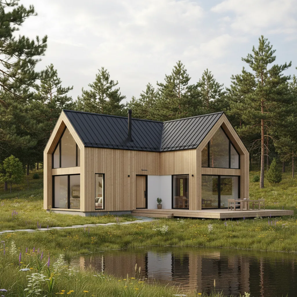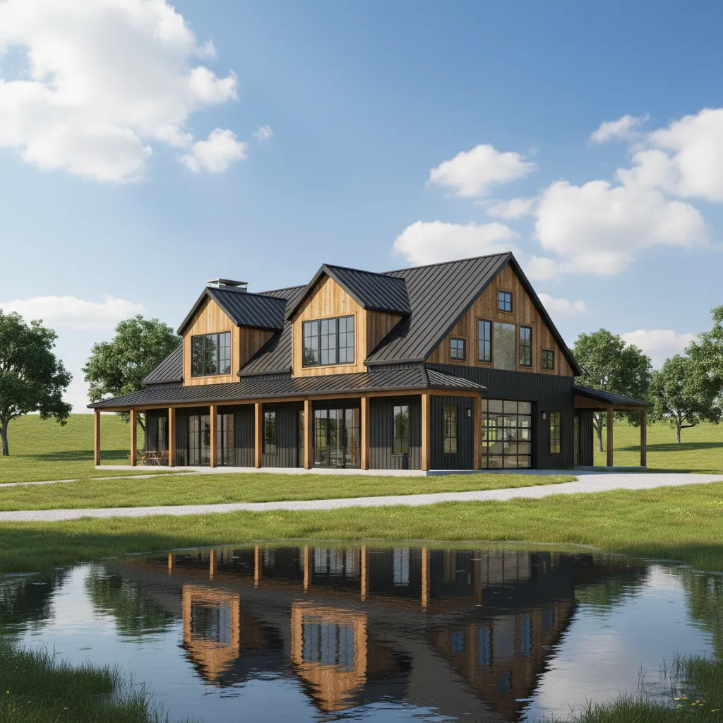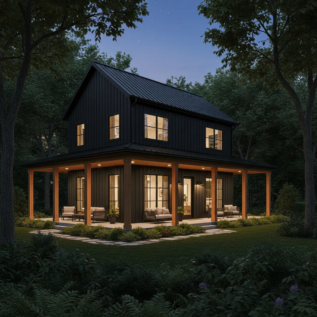 For those who want to make a bold statement, an all-black exterior is incredibly striking. Matte black steel siding absorbs light and contrasts beautifully with the surrounding greenery. To keep it from feeling too cold, incorporate natural wood columns on the porch and warm lighting fixtures.