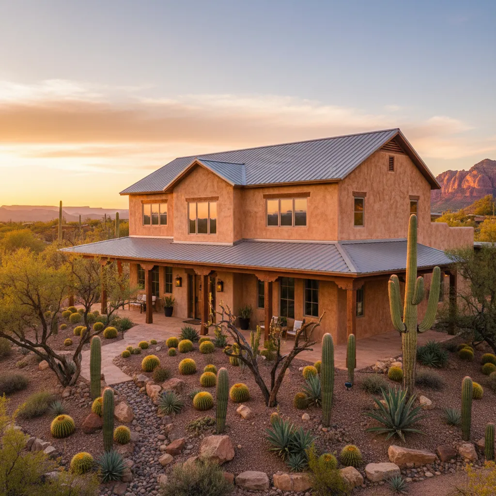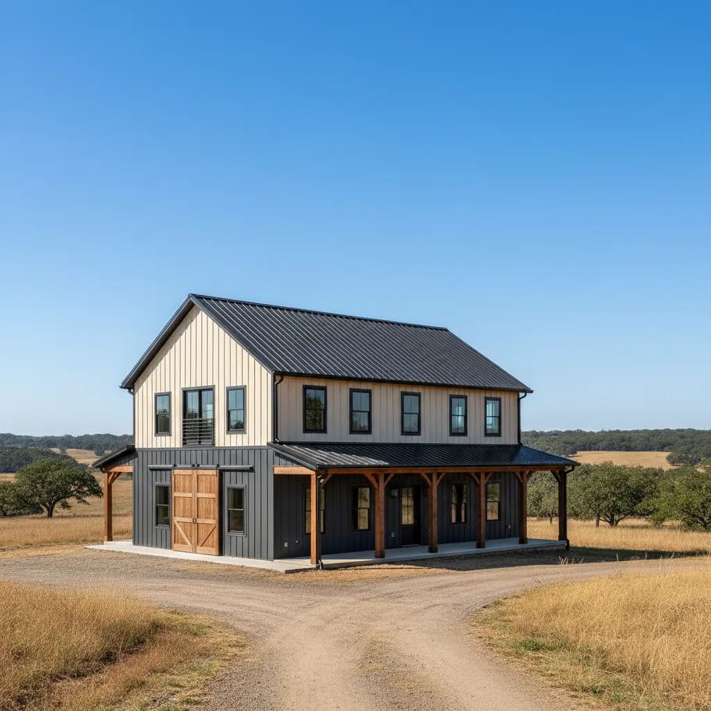 In arid climates, a barndominium can take on a desert vibe. Using stucco finishes in warm earthen tones, paired with a metal roof, blends durability with regional style. Large wooden beams and cactus landscaping complete the look.