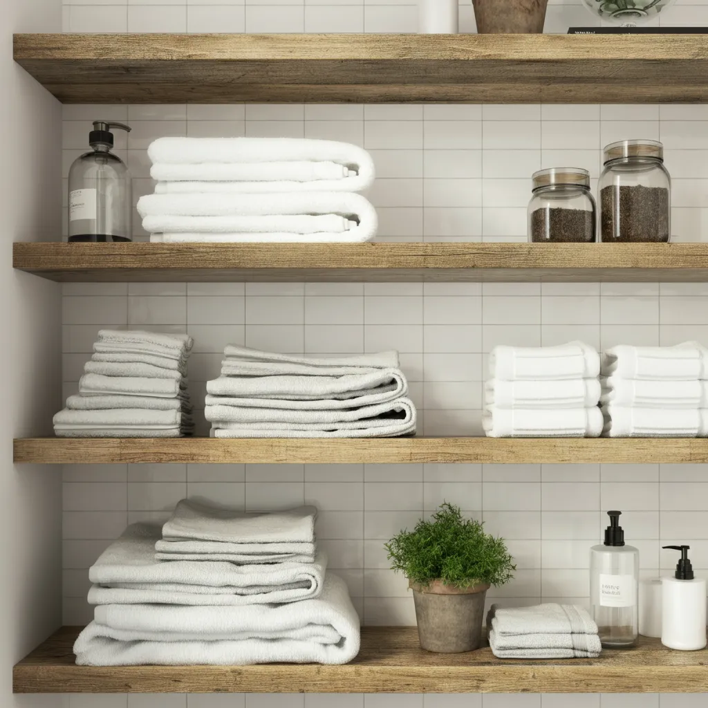 Replace bulky cabinets with open shelving to display neatly folded towels, plants, or decorative jars. Use reclaimed wood or metal brackets for a rustic or industrial look.