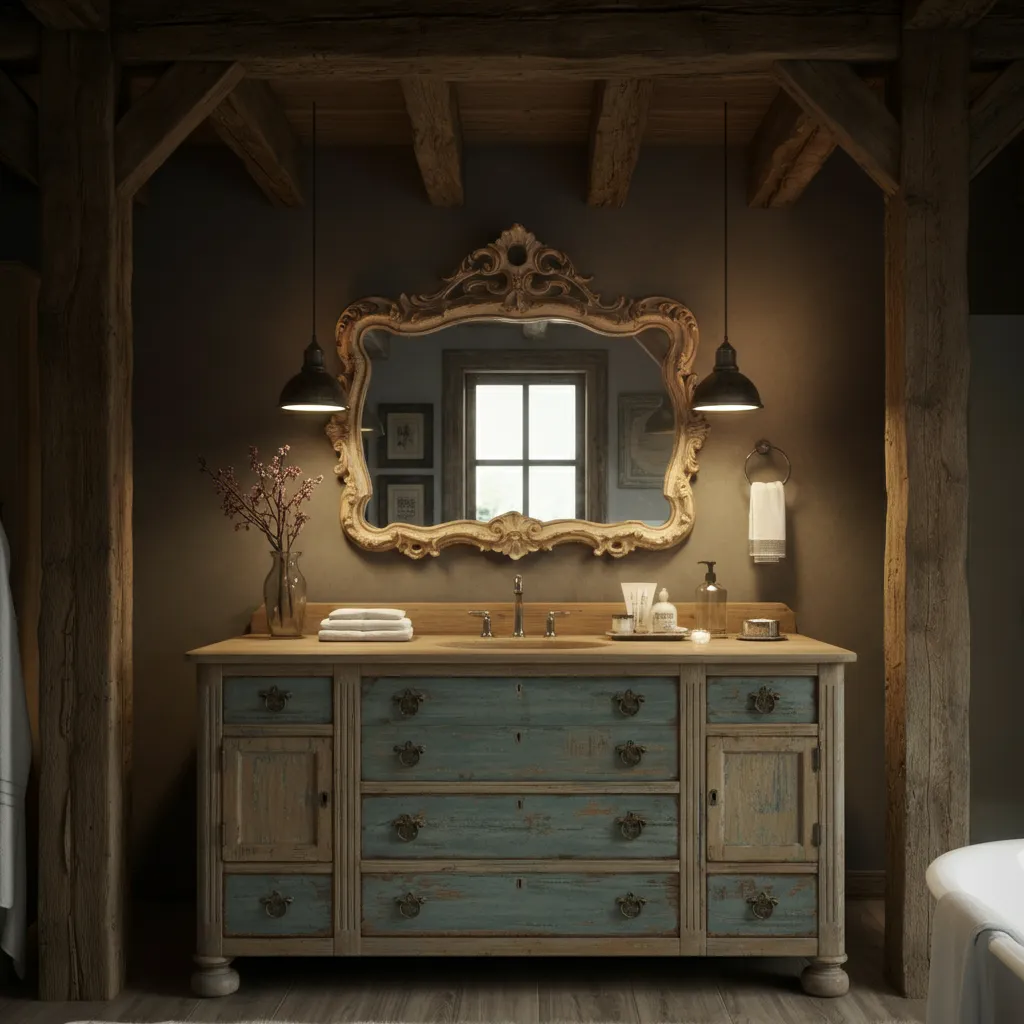 Incorporate vintage furniture like a repurposed dresser as a vanity or an antique mirror. Pair these with rustic elements like exposed beams or distressed finishes for a cozy, lived-in feel.