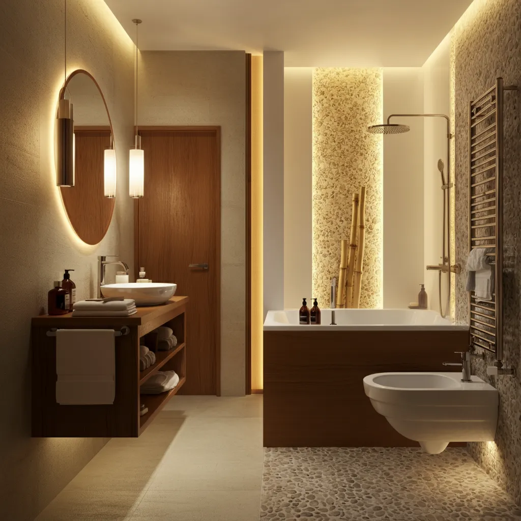 Incorporate natural materials like wood, stone, and bamboo to create a serene, spa-like environment. Wooden vanities, pebble shower floors, and bamboo accessories bring warmth and texture.