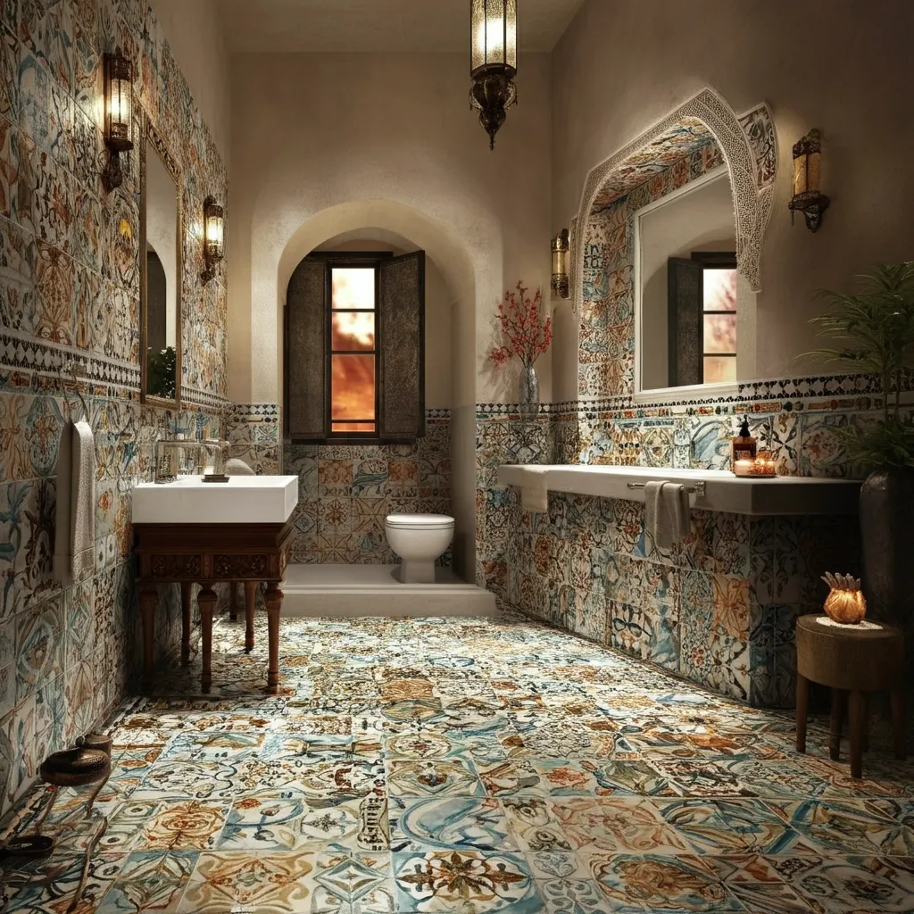 Stunning bathroom decor combines style and functionality. Elements include elegant fixtures, statement mirrors, decorative tiles, layered textures, ambient lighting, and thoughtful accessories that enhance the space.