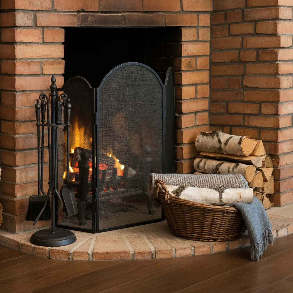 Don’t let the hearth be an empty space. A stylish set of fireplace tools, a decorative screen, and a beautiful log holder can add both function and flair. A basket of cozy blankets or a stack of birch logs can also add a warm, inviting touch.