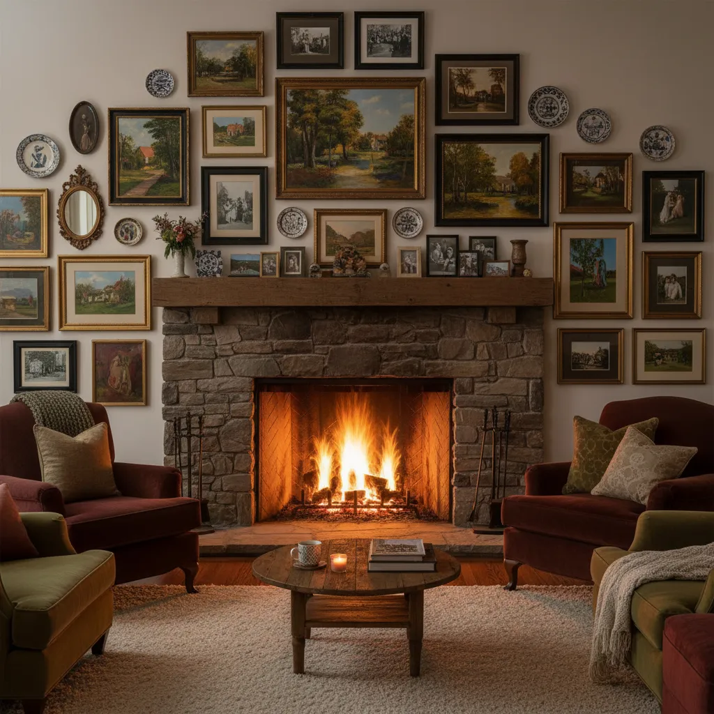 Turn your fireplace into an artful display by creating a gallery wall above it. Mix and match frames, artwork, and photos for a personalized touch.