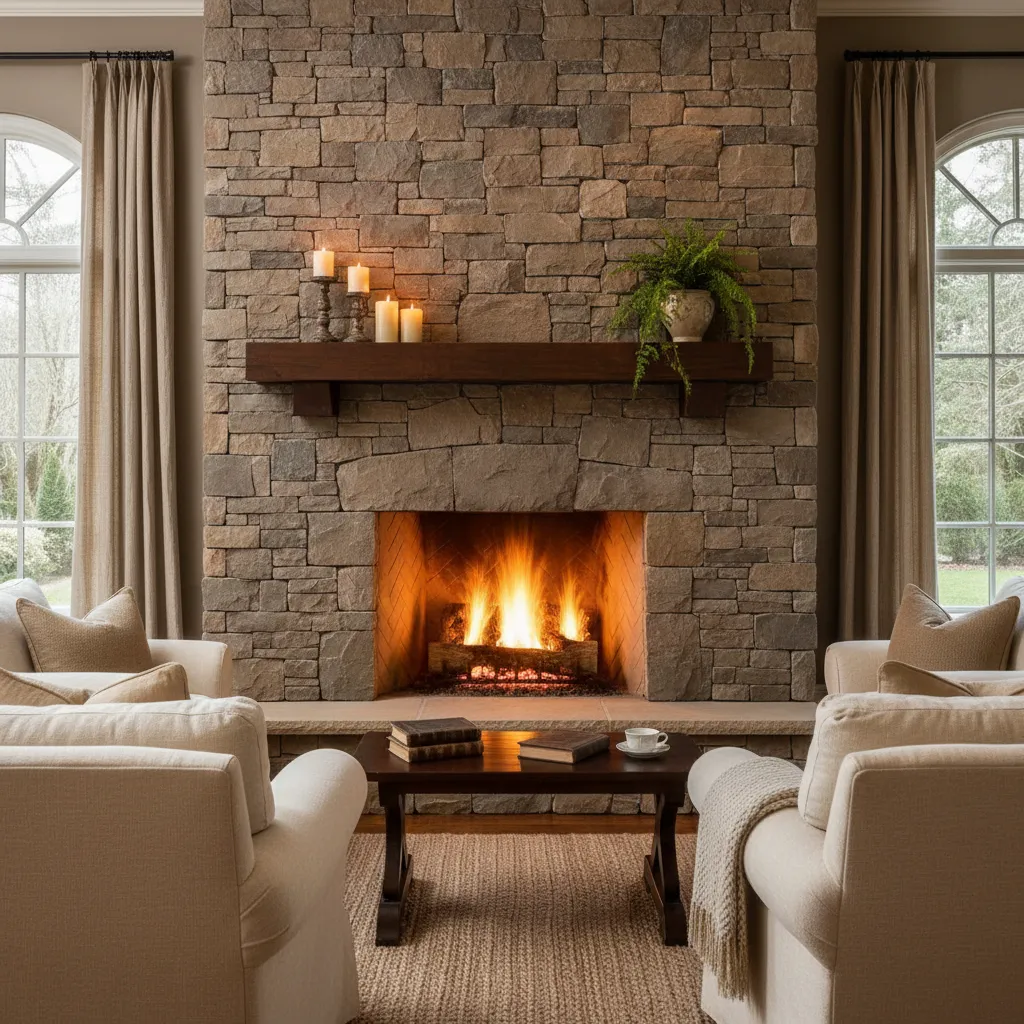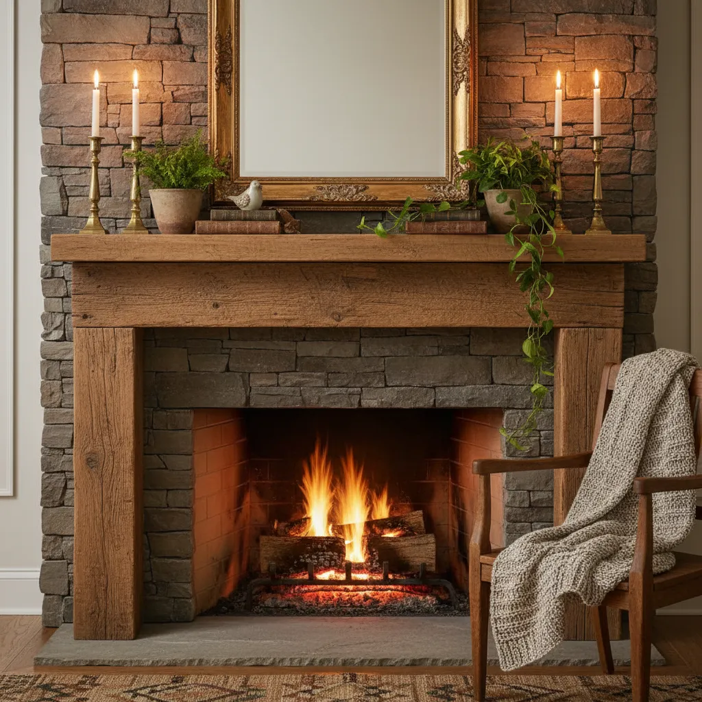 A reclaimed wood mantel adds warmth and character to any fireplace. Pair it with vintage decor items like candlesticks or framed art for a cozy, farmhouse-inspired look.