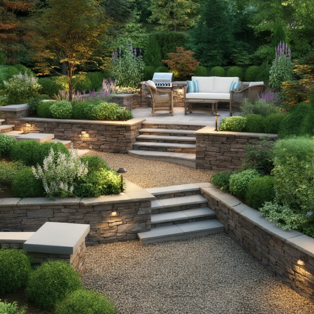If your backyard has a slope, embrace it by creating a multi-level gravel patio. Use retaining walls made from stone or wood to build distinct tiers. This adds visual interest and creates separate zones for dining, lounging, or a fire pit.