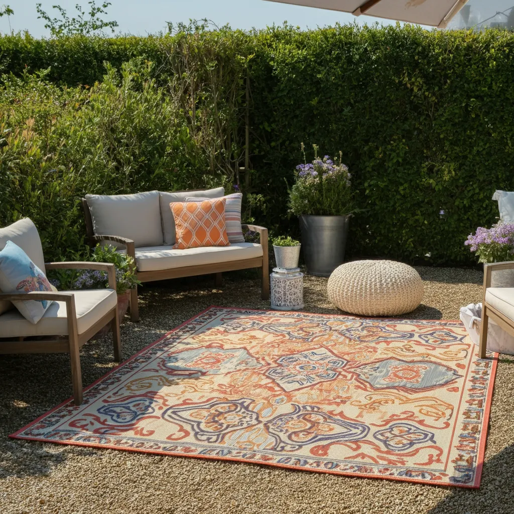 An outdoor rug can define a seating or dining area on your gravel patio. It adds a layer of comfort, color, and pattern, making the space feel more like an outdoor room.
