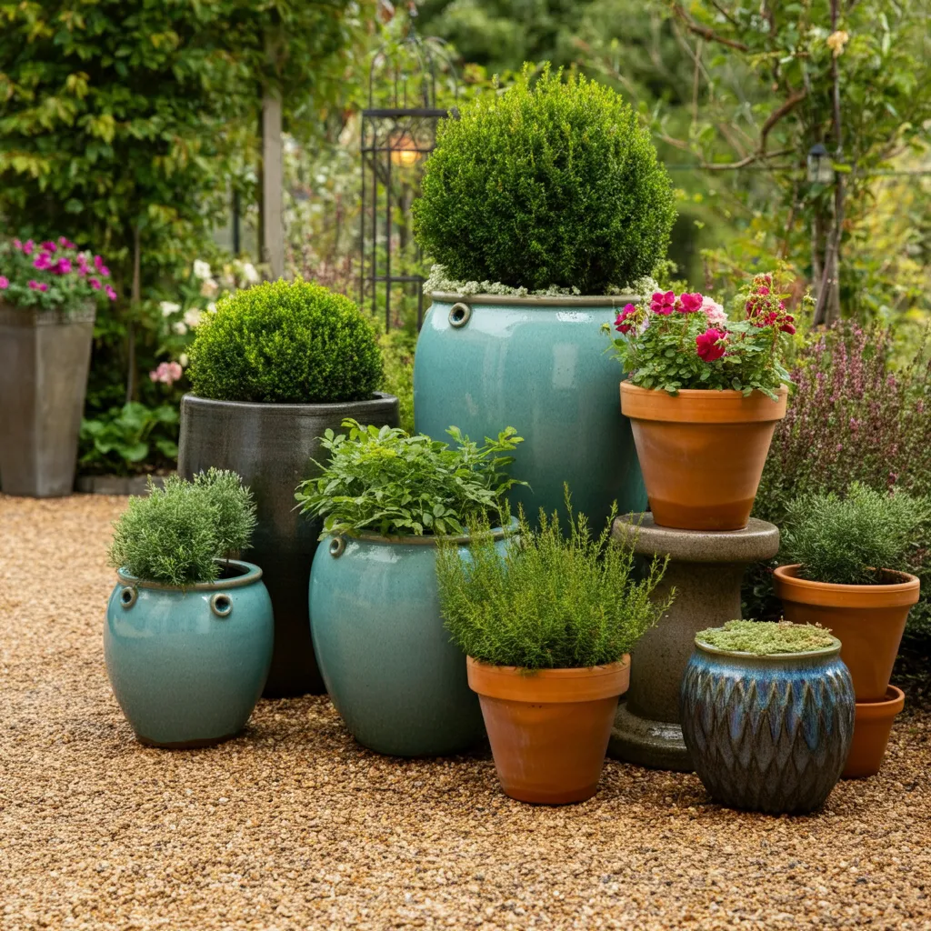 Incorporate potted plants directly on the gravel. Grouping containers of various sizes and materials adds color, texture, and life to the patio. This is a flexible way to change your decor with the seasons.