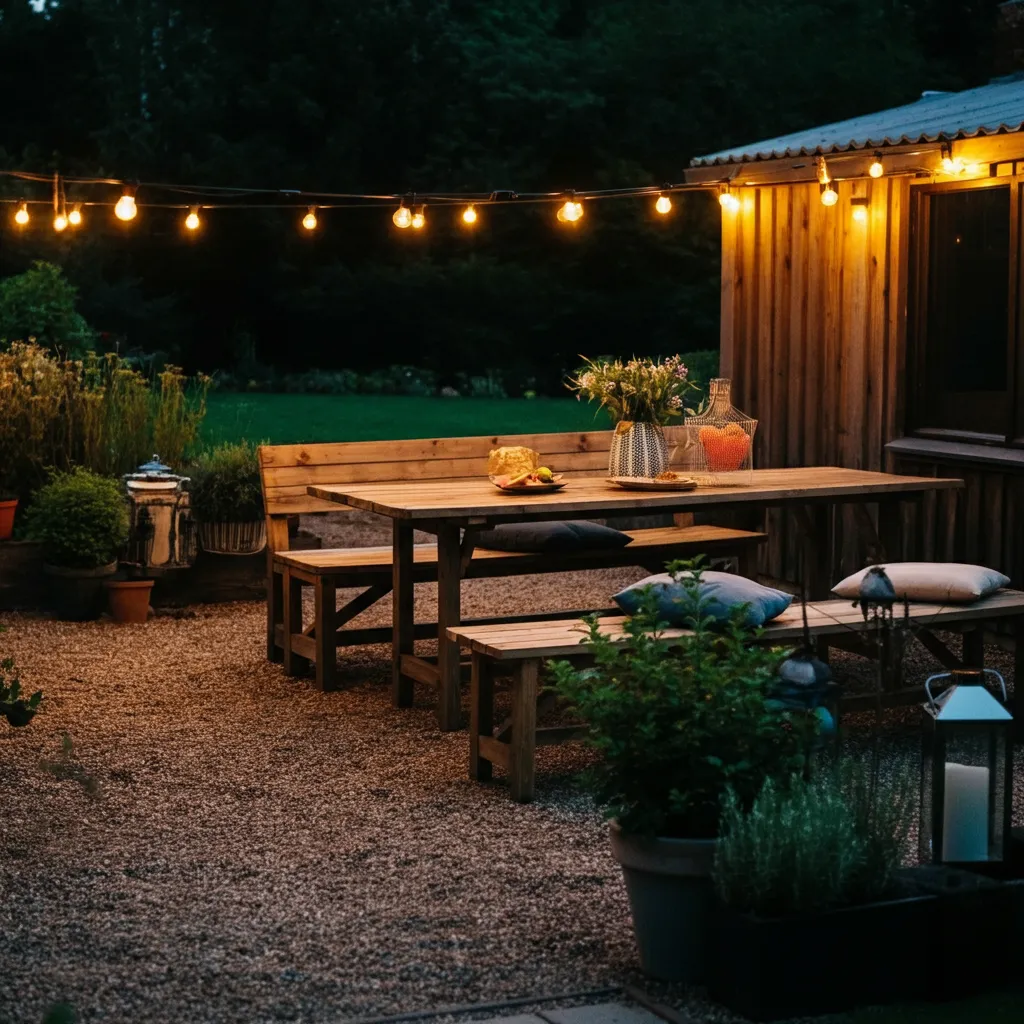 Set up an outdoor dining area on your gravel patio. A simple wooden table paired with benches or modern chairs creates a charming, rustic atmosphere. String lights overhead to add a magical glow for evening meals.