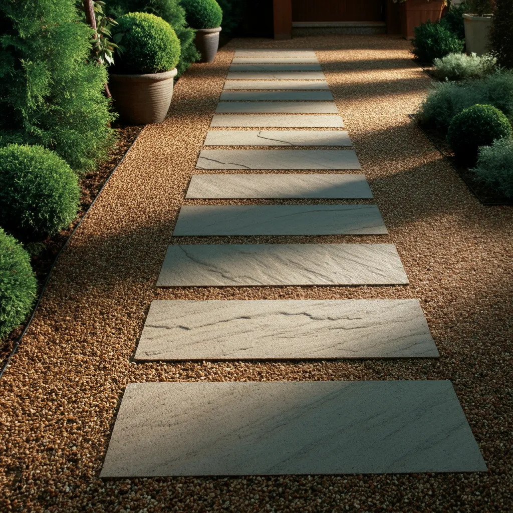 Lay large, flat pavers or flagstones within the gravel to create a solid pathway. This breaks up the texture of the gravel and provides a stable surface for walking, making the area more practical and visually appealing.