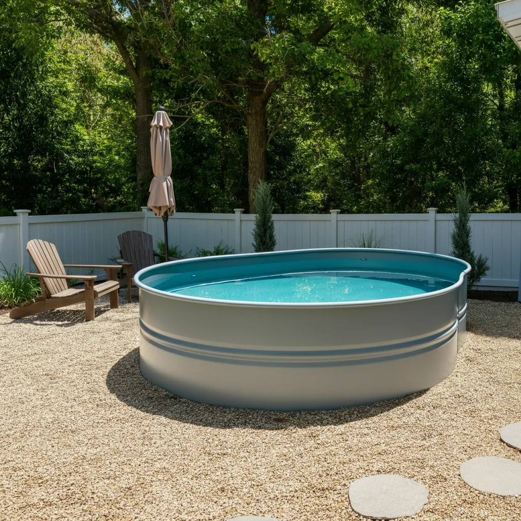 For a fun and trendy addition, place a stock tank pool next to your gravel patio. It’s a stylish and affordable way to cool off during hot summer days and adds a unique, playful element to your backyard.