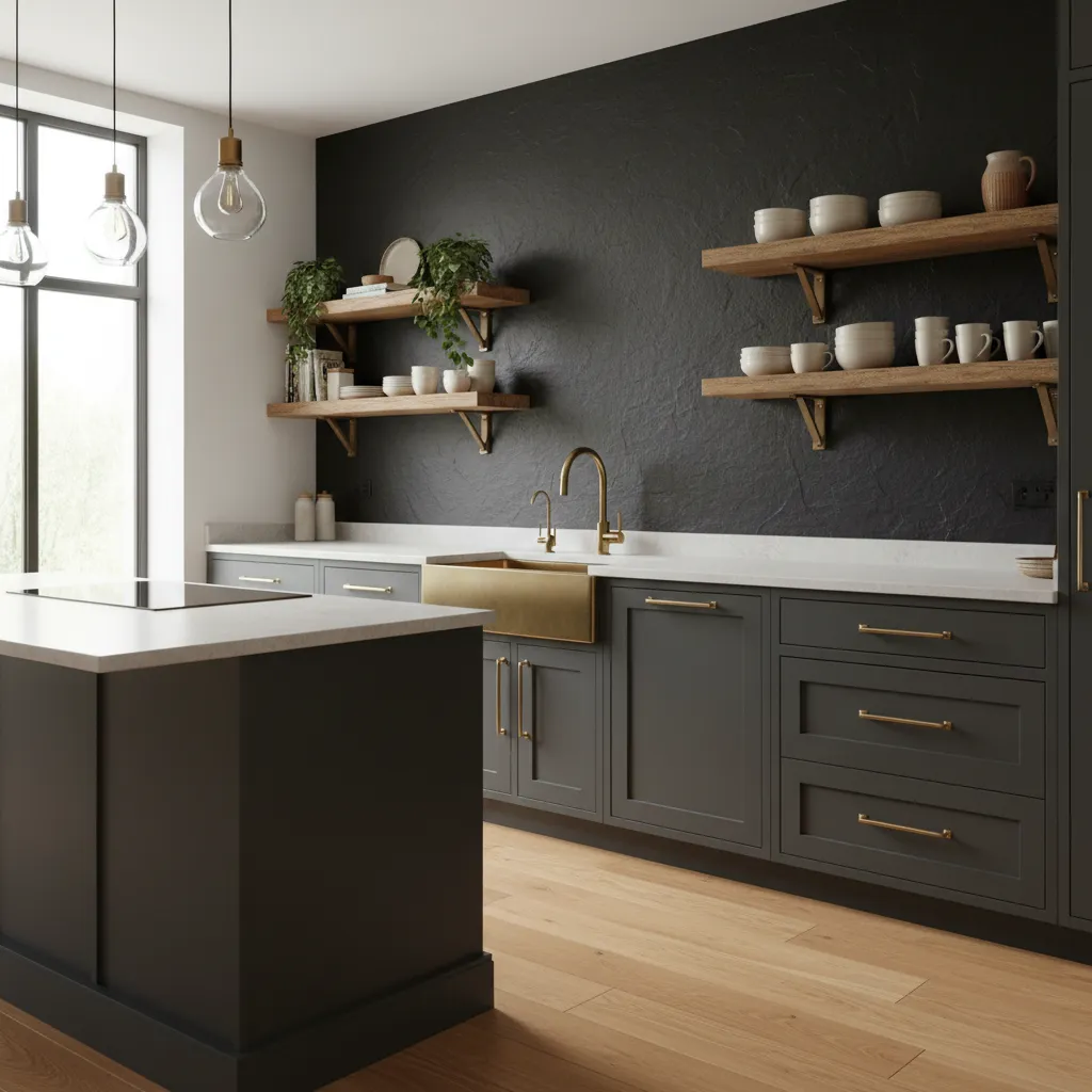 Dark interiors are having a moment, and for good reason. A matte black slate backsplash creates a dramatic, cozy atmosphere, especially when paired with warm wood shelving or brass hardware. It feels sophisticated yet grounded—a perfect hideaway for evening cooking.