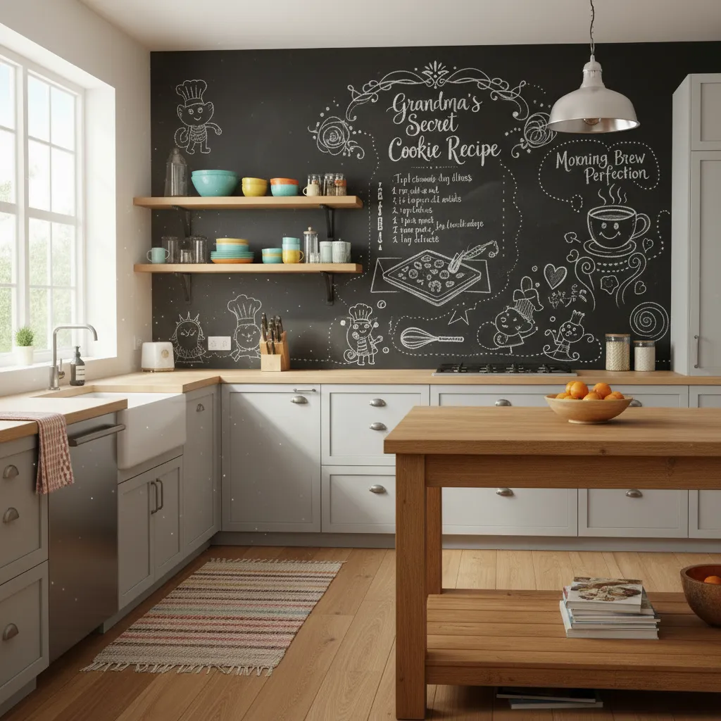 Fun, functional, and undeniably cozy. A chalkboard backsplash allows you to write down recipes, grocery lists, or sweet notes for your family. It’s a dynamic surface that changes with your life, adding a personal touch that permanent tile can’t match.
