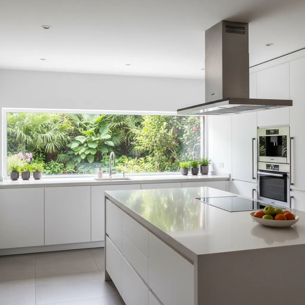 If your kitchen layout allows, replace the wall area between the counter and cabinets with a long, horizontal window. It invites nature inside, flooding your workspace with natural light and providing a constantly changing view of the outdoors.