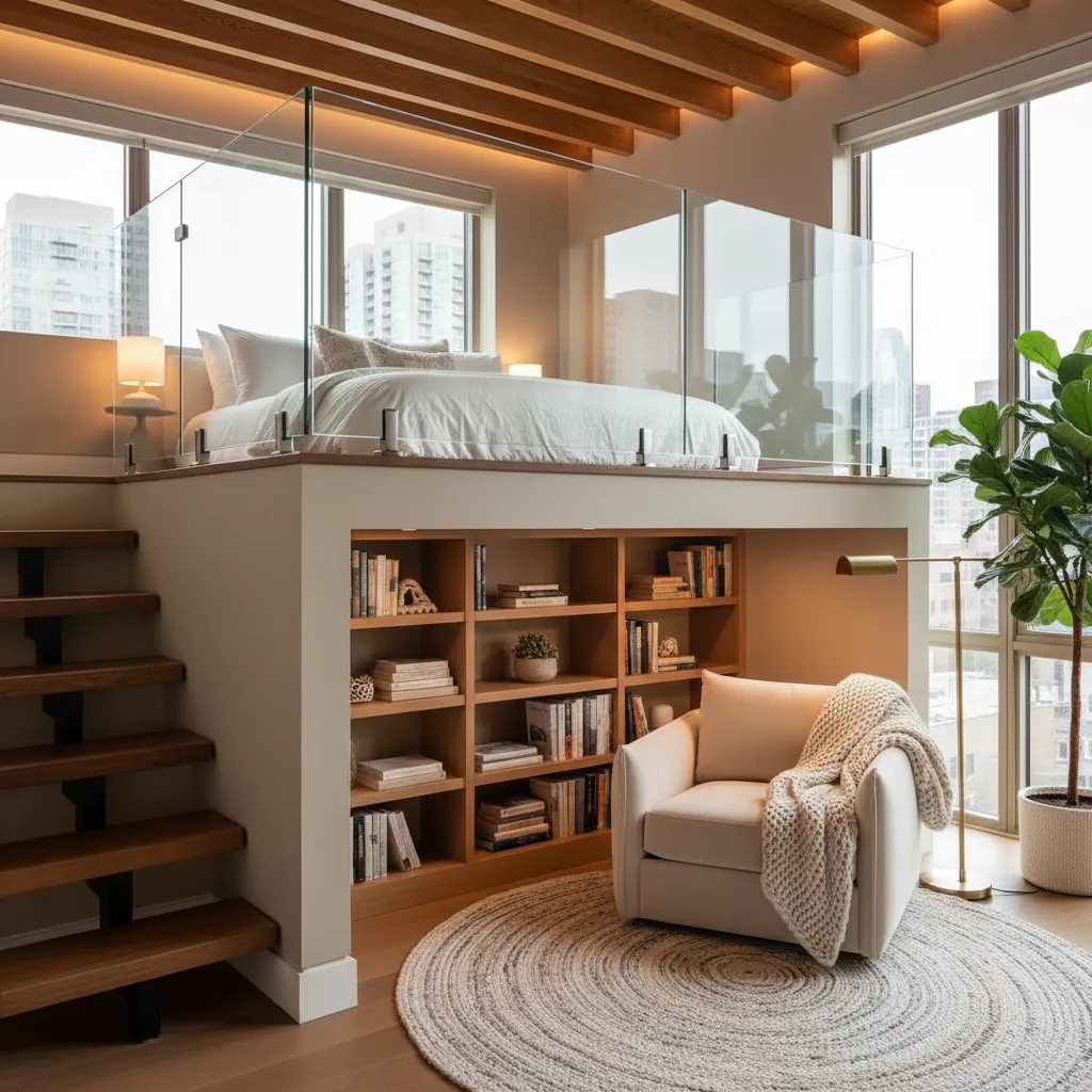 Instead of heavy wooden barriers, install clear glass railings along the edge of your loft. This keeps you safe while allowing natural light to flow freely through the room.