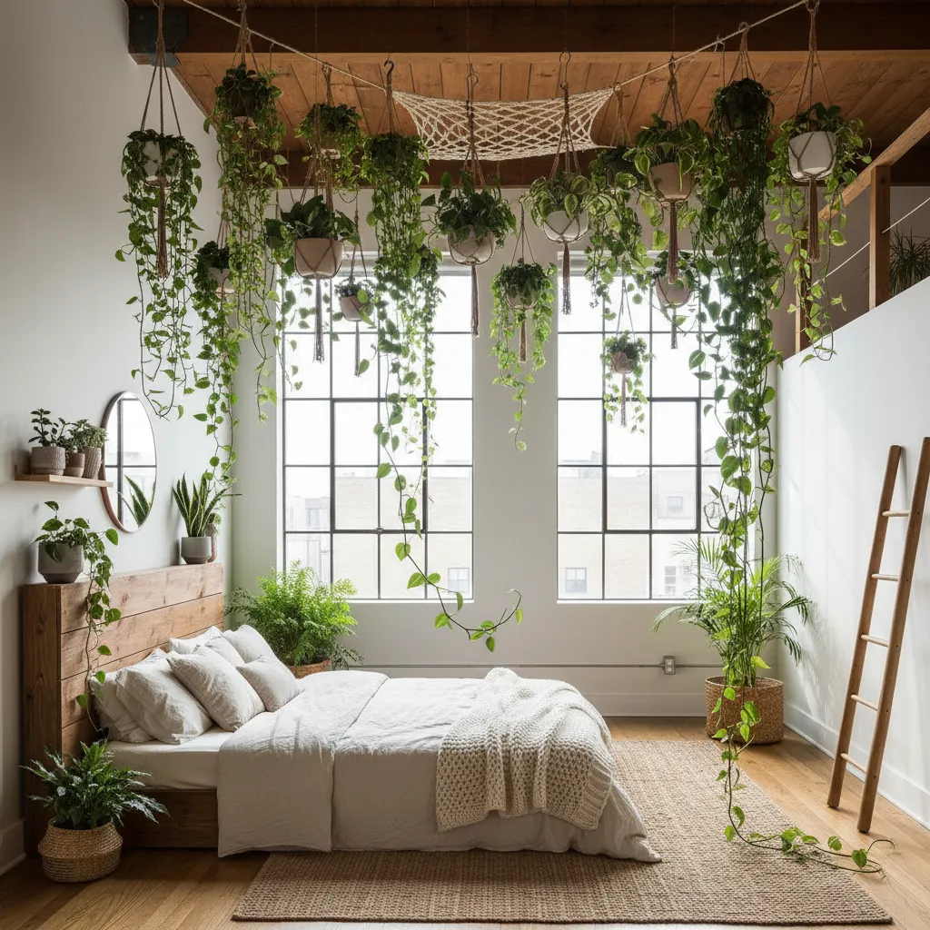 Suspend trailing plants like pothos or string of pearls from the ceiling near your bed. They purify the air and add a burst of natural color without taking up floor space.
