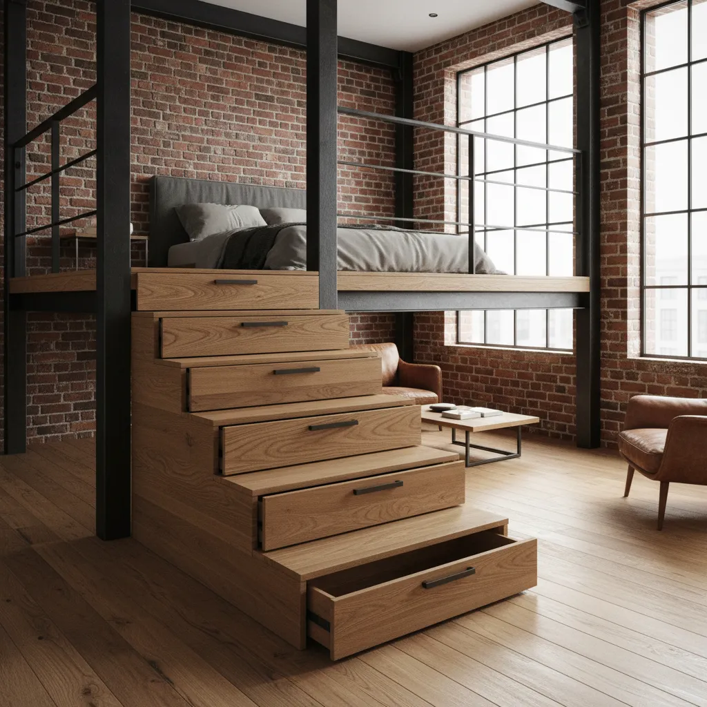 Skip the traditional ladder. Build stairs leading up to your bed where each step functions as a pull-out drawer. This maximizes storage for clothes and extra bedding.
