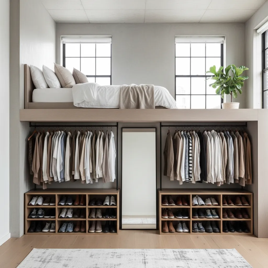 Use the footprint underneath your elevated bed for clothing racks, shoe cubbies, and a full-length mirror. You instantly get the walk-in closet you always wanted.