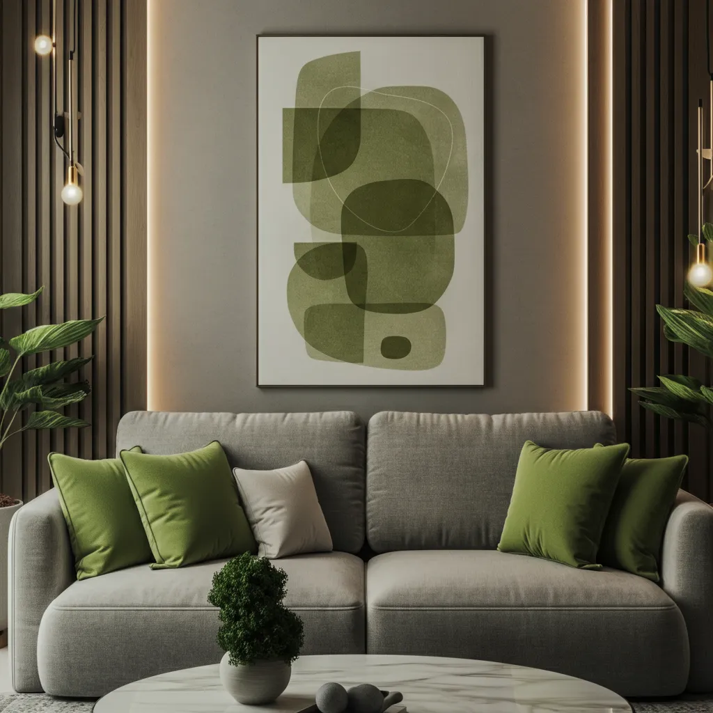 Select a piece of abstract art where olive green is a prominent color. It can serve as a conversation starter and a central piece of your home decor.
